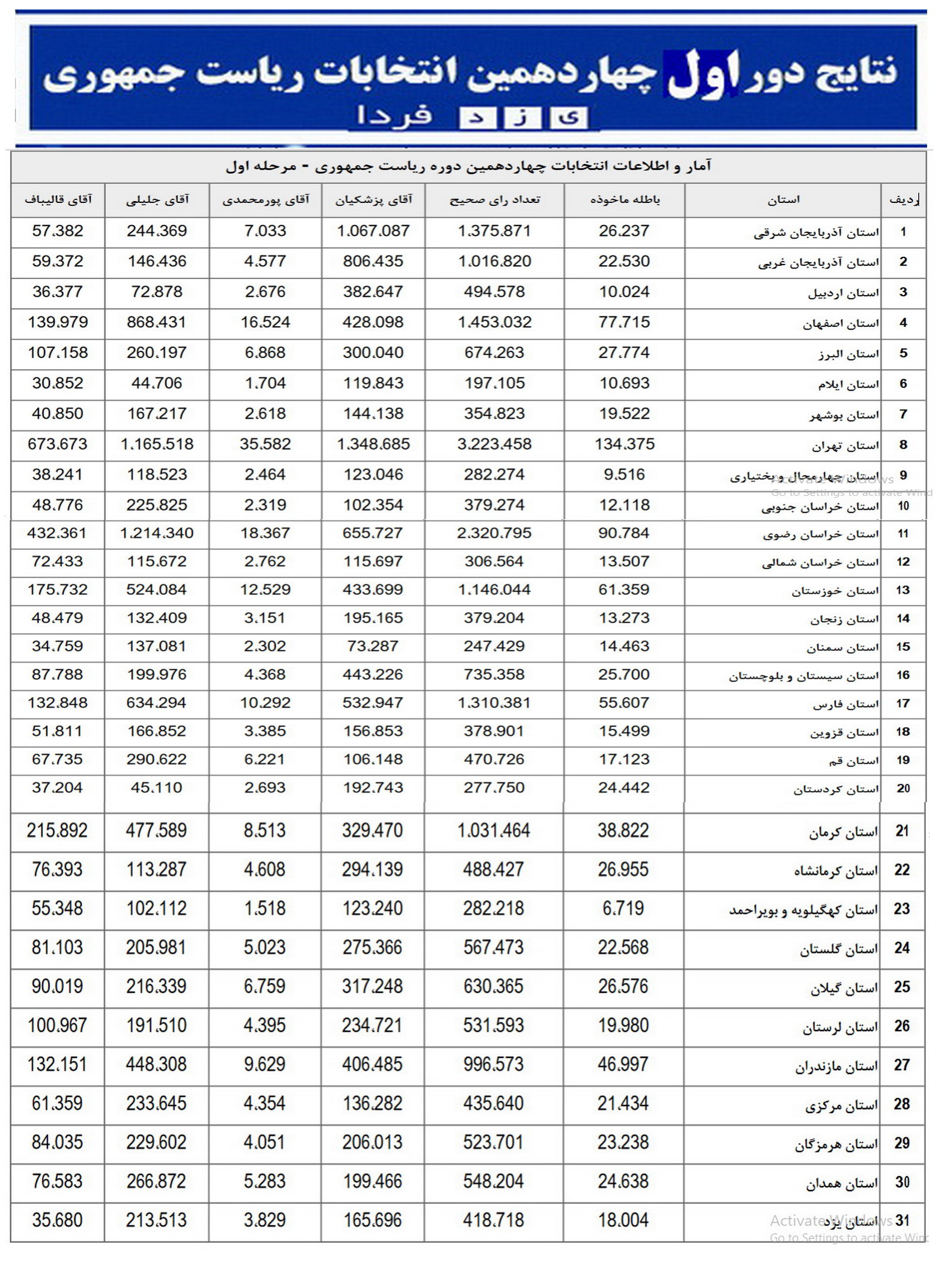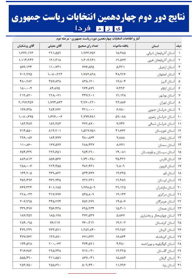 یزدفردا: ستاد انتخابات کشور آمار تفکیکی مرحله‌ی دوم انتخابات ریاست جمهوری را منتشر کرد.