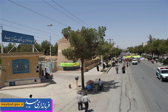 به گزارش روابط عمومی فرمانداری میبد، مردم همیشه درصحنه میبد که درس ایثار، شجاعت، مقاومت و حضور درصحنههای سرنوشتساز را از پیر پارسایان خود، مرحوم حضرت آیتالله اعرافی امامجمعه فقید این شهرستان طی دوران انقلاب فراگرفتهاند؛ امروز هم بافهم درست از شرایط جهان اسلام و کشورمان در عرصههای بینالمللی، با حضور باشکوه و گسترده خود در راهپیمایی روز جهانی قدس، برگ زرین دیگری در حمایت از مظلومان عالم بهویژه مردم مظلوم فلسطین به برگهای تاریخ افزودند.
