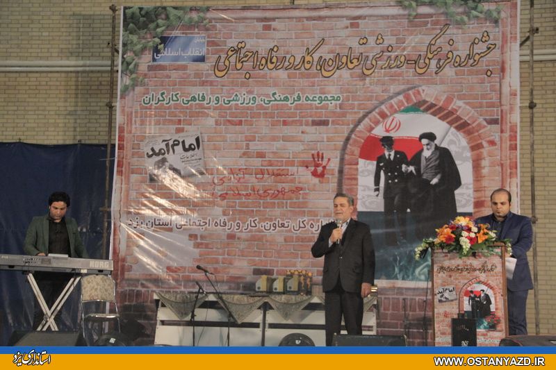 به گزارش اداره كل روابط عمومي استانداري يزد، جشنواره فرهنگي ورزشي تعاون، كار و رفاه امور اجتماعي يك شنبه شب 12 بهمن ماه در مجموعه فرهنگي و ورزشي كارگران يزد با حضور استاندار يزد، معاون سياسي، امنيتي و اجتماعي استاندار، معاون توسعه مديريت و منابع انساني استاندار، فرماندار يزد، مدير كل روابط عمومي استانداري و مقامات استاني برگزار شد.