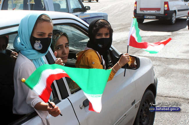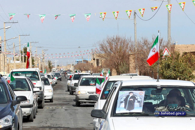 مردم بهاباد در این مراسم که برخی از آنها به صورت خانوادگی در خودروها حضور داشتند، با تزئین وسیله نقلیه خود به پرچم ایران و پوسترهای انقلابی، جلوه های ویژه ای را خلق کردند.