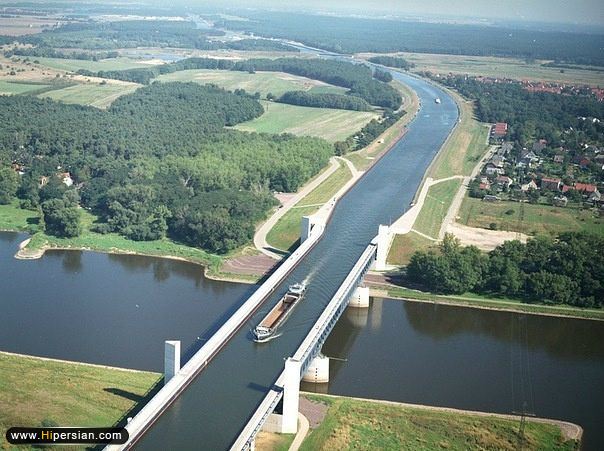 عکس:یک رودخانه بر روی یک رودخانه دیگر. پل آبی ماگدبورگ در آلمان