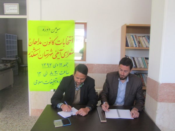 به گزارش روابط عمومی اداره تبلیغات اسلامی شهرستان اشکذر ،سومین دوره انتخابات کانون مداحان شهرستان اشکذر با رقابت 10 کاندیدا همزمان با سراسر کشور صبح روز جمعه 12/10/1393 در محل اداره تبلیغات اسلامی اشکذر برگزار شد.