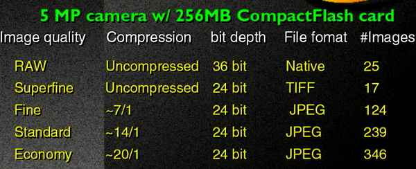 يک دوربين ديجيتال بهترين تصويرش را در بالاترين رزولوشن و کمترين فشرده سازياش ميگيرد. هر چند در زمان استفاده فرمتهاي غير فشرده زمان زيادي براي ضبط شدن روي حافظه دوربين ميبرد و ضمنا فايل بسيار بزرگي توليد ميشود که بزودي حافظه دوربين شما را خواهد بلعيد. بخاطر همين فرمت JPEG با کمترين فشردگي را براي عکاسيهاي روزمره توصيه ميکنيم. در اين فرمت عکسها زمان کمتري براي ضبط شدن ميگيرد و نتيجه نهايي نيز تقريبا با فرمت غير فشرده قابل تشخيص نيست. متاسفانه بيشتر دوربين ها داراي حافظه کافي براي عکاسي نيستند و بعداز خريد دوربين حتما بايد به فکر يک حافظه بالاتر باشيد.