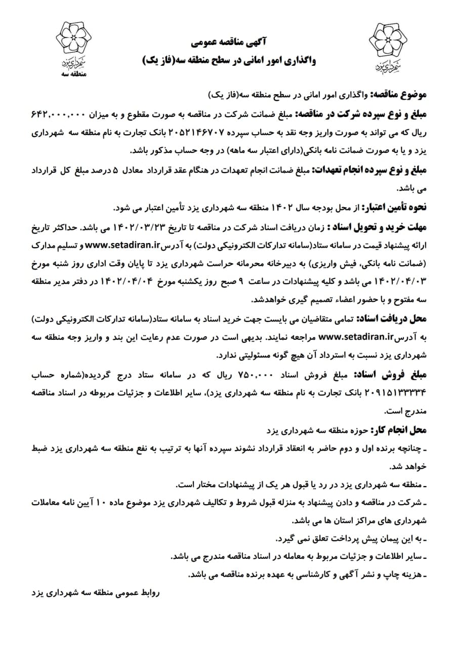 مناقصه واگذاری امور امانی - منطقه سه